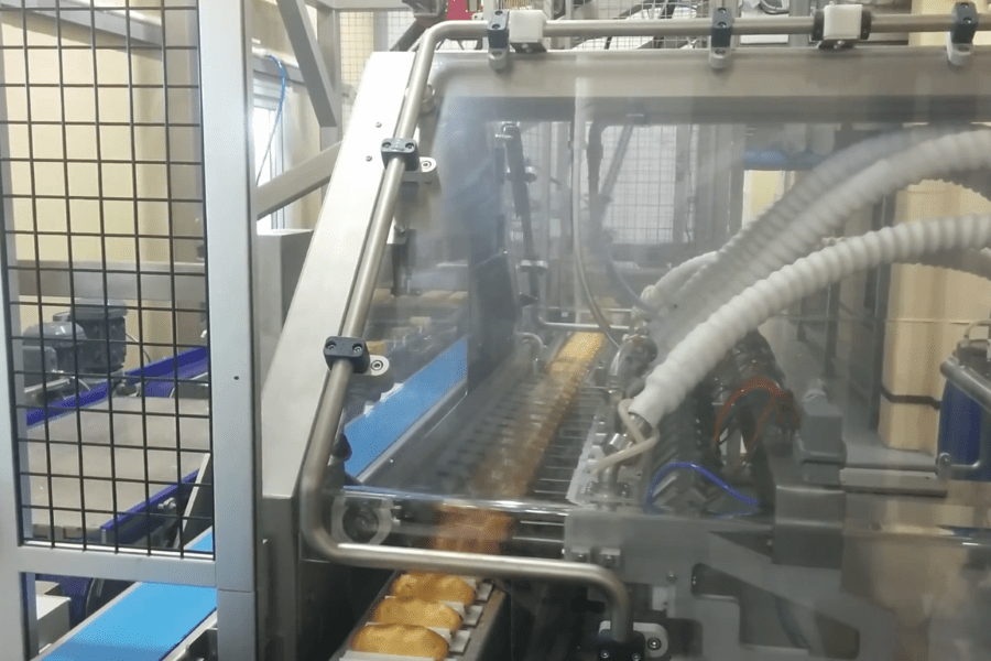 Automatiquement par un un robot ou un démouleur qui dépose des rangs de produits dans les godets de la chaîne